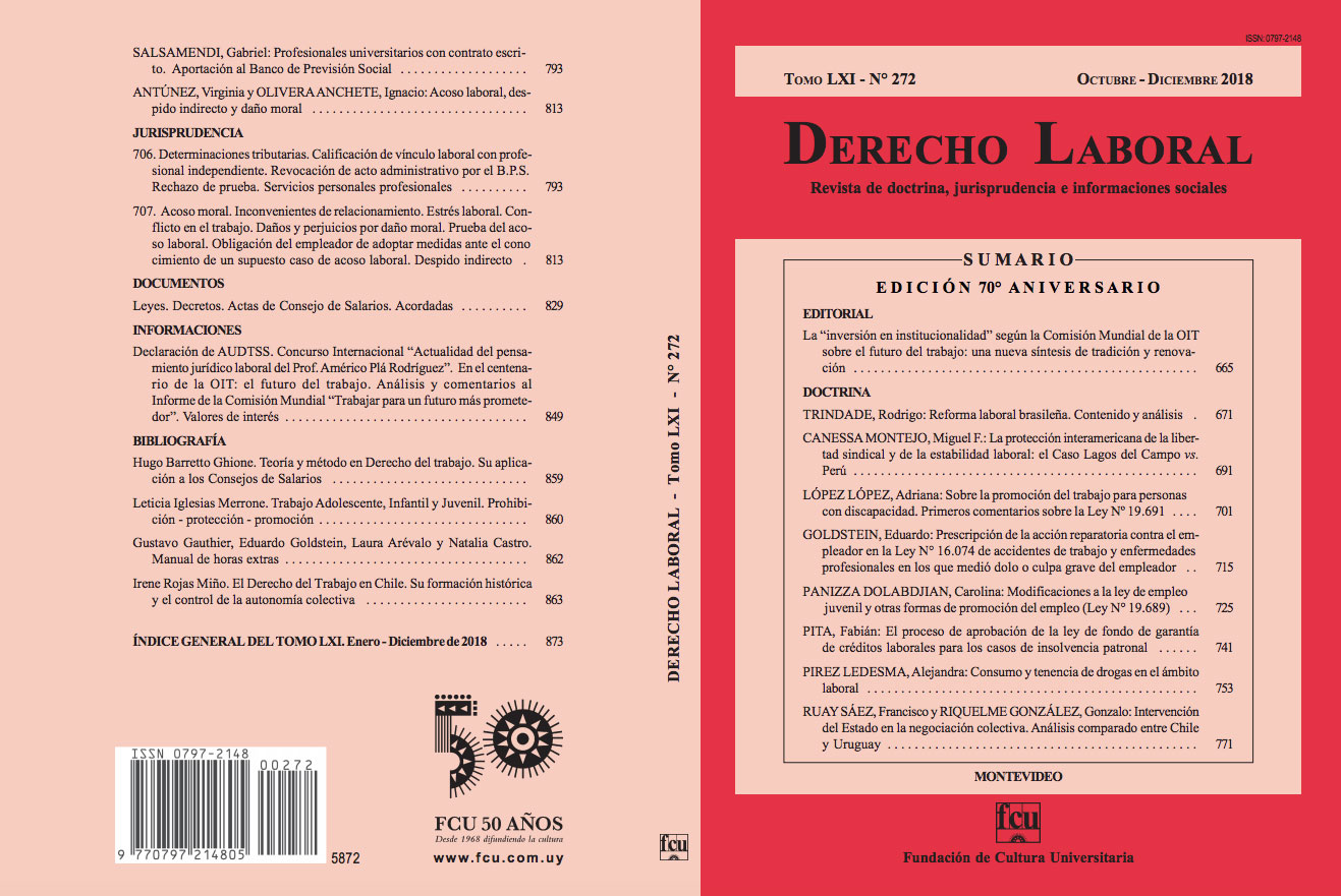 TOMO LXI - Nro 272 E D I C I Ó N 70° A N I V E R S A R IO - FCU, Montevideo, 1ª edición febrero 2019 Envíe sus datos de contacto a libreria@fcu.edu.uy para suscribirse a la revista Derecho Laboral NEWSLETTER Subscripción a novedades, eventos y noticias de nuestra Fundación Name Email SUBSCRIBIRME REDES SOCIALES Seguínos en : Twitter Facebook Linkedin