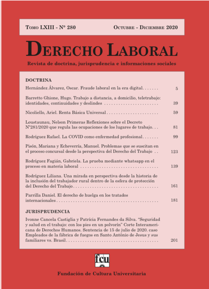 Revista Derecho Laboral, Vol. 63 Núm. 280 (2020) : teletrabajo, renta básica,