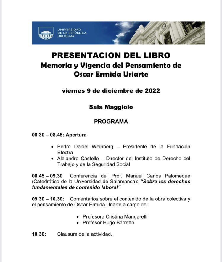 Con mucha alegría invitamos a todos ustedes a la presentación del libro en homenaje a la “Memoria y Vigencia del Pensamiento de Oscar Ermida Uriarte". Los esperamos el viernes 9 de diciembre a las 08:30 hs. en la Sala Maggiolo (UDELAR)