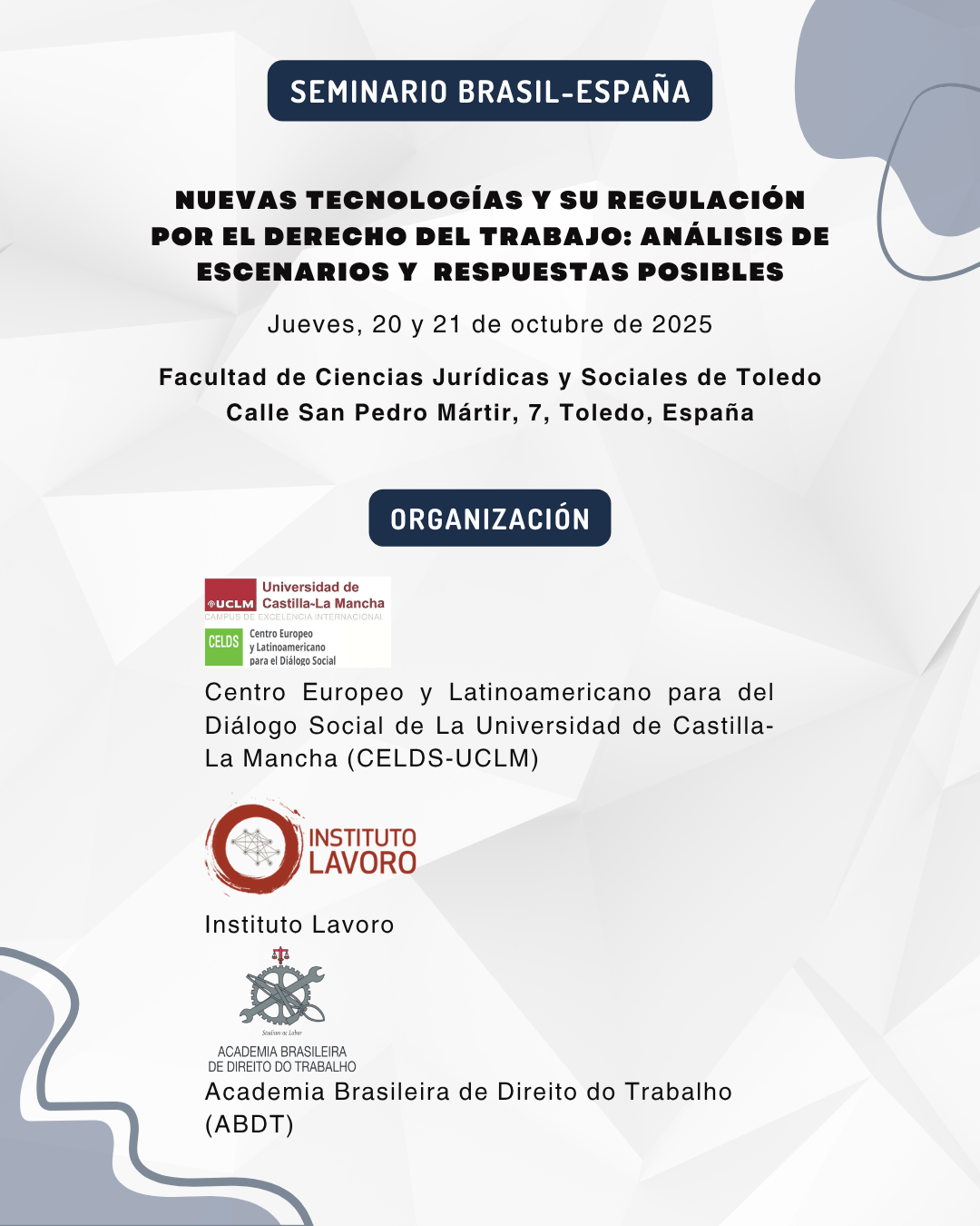 “Nuevas Tecnologías y su Regulación por el Derecho del Trabajo: Análisis de Escenarios y Respuestas” organizan CELDS-UCLM-IL-ABDT, evento online gratuito