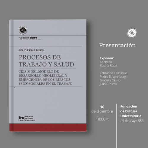 3. ENLACE AL Video de la presentaciòn del libro, realizada por Fundación Electra y FCU https://www.youtube.com/watch?v=yJjF0OLXCYw (Montevideo, 16 de diciembre de 2024) Expositores: Dra. Rosina Rossi, Presidenta de Fundación Electra. Profesora de Derecho del Trabajo y de la Seguridad Social de la Facultad de Derecho de la Universidad de la República, Ministra del Tribunal de lo Contencioso Administrativo del Uruguay,Dr. Fernando Tomasina, Autor del Prólogo. Profesor Titular de la Unidad Académica de Salud Ocupacional de la Facultad de Medicina, Ex Decano de la Facultad de Medicina / UdelarSr. Pedro Daniel Weinberg, Autor de la Presentación. Ex presidente de la Fundación Electra. Ex director de OIT/Cinterfor.Dra. Graciela Giuzio – Profesora Adjunta de Derecho del Trabajo y de la Seguridad Social. Facultad de Derecho. UDELAR.Dr. Julio C. Neffa. Licenciado en Economía Política – Universidad de Buenos Aires, Diplomado en la Escuela Nacional de Administración (ENA) de Francia. Doctor en Ciencias Sociales del Trabajo de la Universidad de Paris I, Investigador Superior del CONICET en el CEIL, Profesor de UBA y Prof. Emérito de la Univ. Nacional de Moreno.